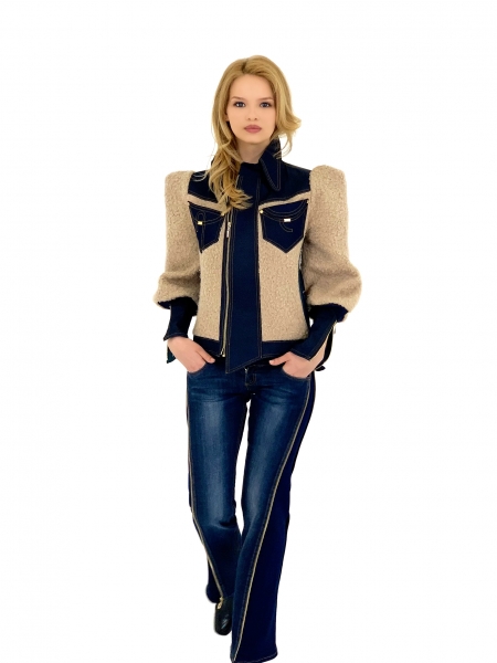 Куртка Camel Wool Denim от ELLA Abushkevich Design оригинального кроя, выполнена из плотной джинсовой ткани и фактурной верблюжьей шерсти цвета карамели. Приталенный силуэт, по бокам – два кармана. Рукава «фонарики» с зауженной частью у запястья, внизу рукава – молнии.