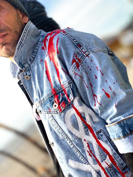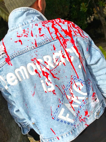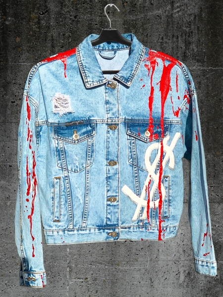 Джинсовая куртка в стиле Unisex от бренда LEPRIOSSA с провакационным авторским принтом "Democracy is FAKE”. Данная модель произведена в единичном экземпляре, в коллаборации ELLA Abushkevich Design c nft-художником Леварсом Надвиковым.