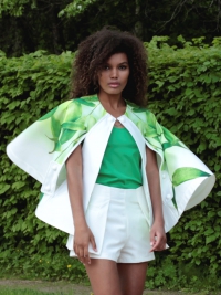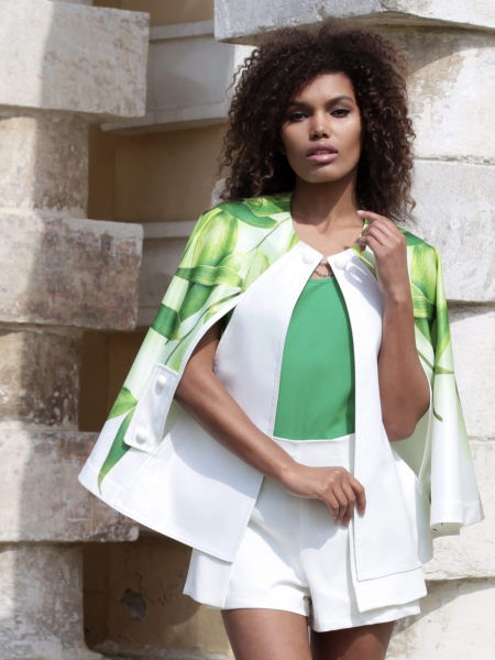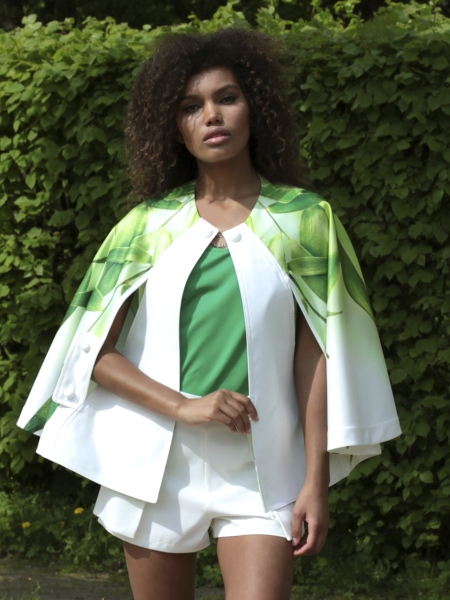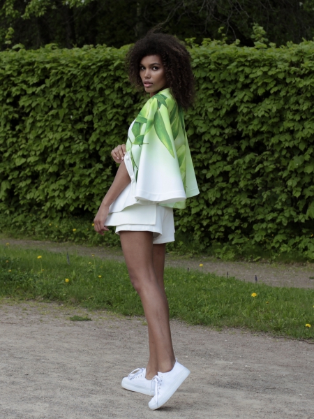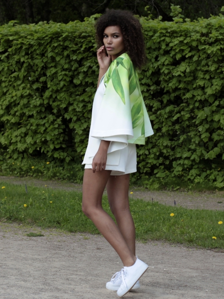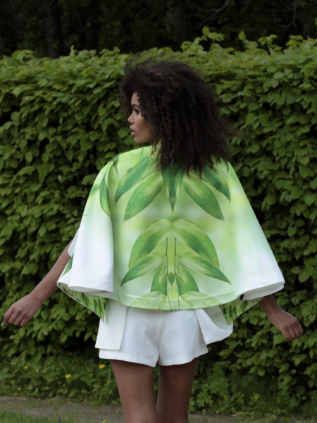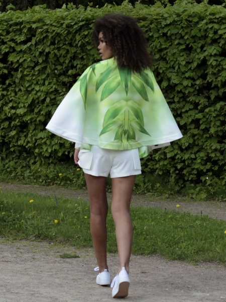 Кейп – стильная накидка без рукавов, дополнит ваш образ и защитит от ветра. Удобные прорези для рук позволят вам чувствовать себя свободно. Модель – эксклюзивная, с авторским принтом с листьями бамбука. Кейп выполнен из непромокаемого атласа. Без подклада, все швы обработаны кантом.