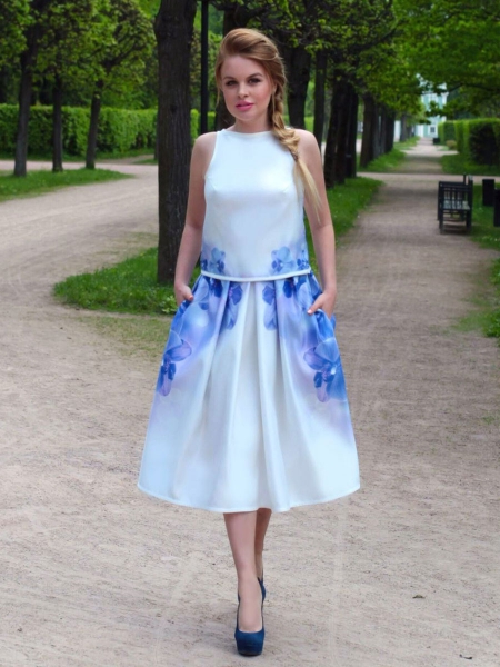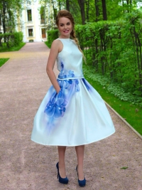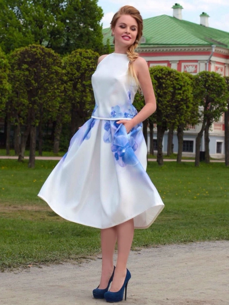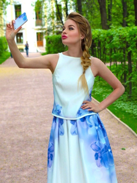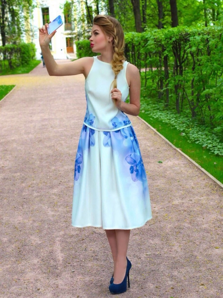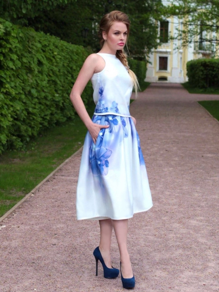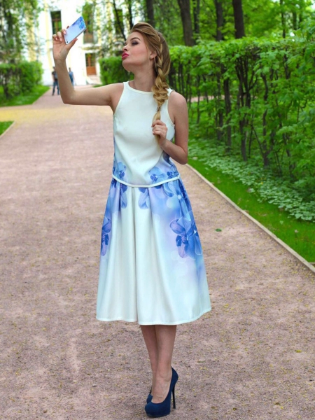 Элегантный и очень женственный летний сет: юбка с бантовыми складками и оригинальный ассиметричный топик с необычным «крылышком» на плече. По бокам на юбке – два кармана. Эксклюзивная модель с авторским принтом на ткани.