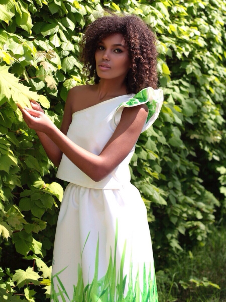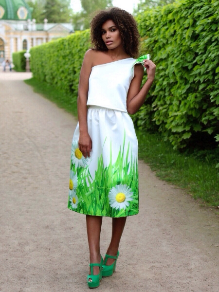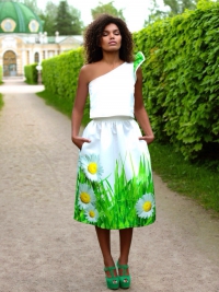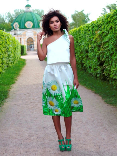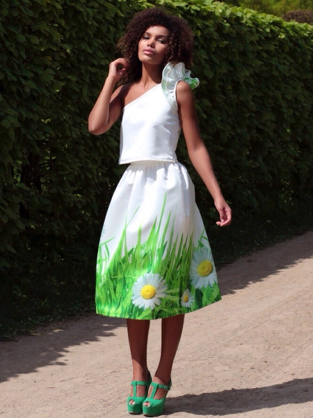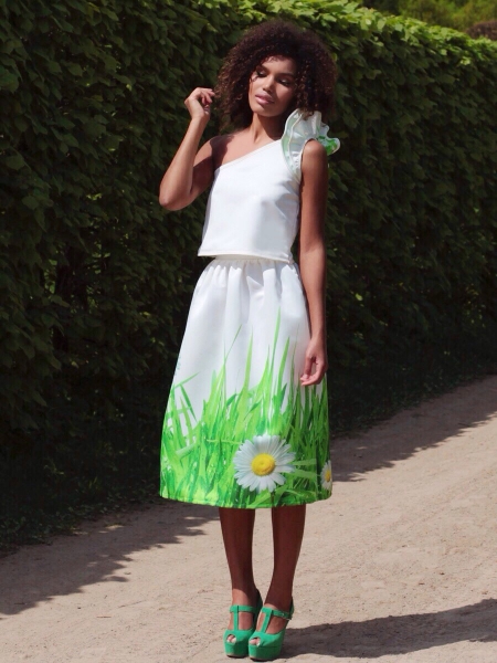 Очень женственный летний сет: юбка-бочонок с высоким поясом и оригинальный ассиметричный топик с необычным «крылышком» на плече. По бокам на юбке – два кармана. Эксклюзивная модель с авторским принтом на ткани.