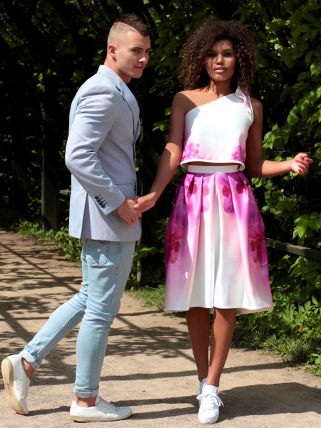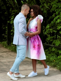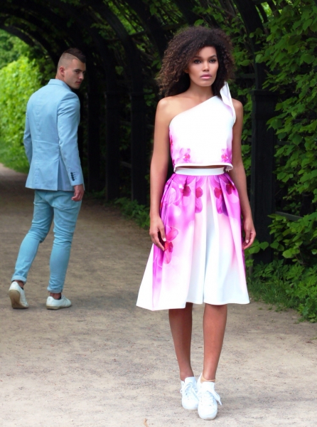 Элегантный и очень женственный летний сет: юбка с бантовыми складками и оригинальный ассиметричный топик с необычным «крылышком» на плече. По бокам на юбке – два кармана. Эксклюзивная модель с авторским принтом на ткани.